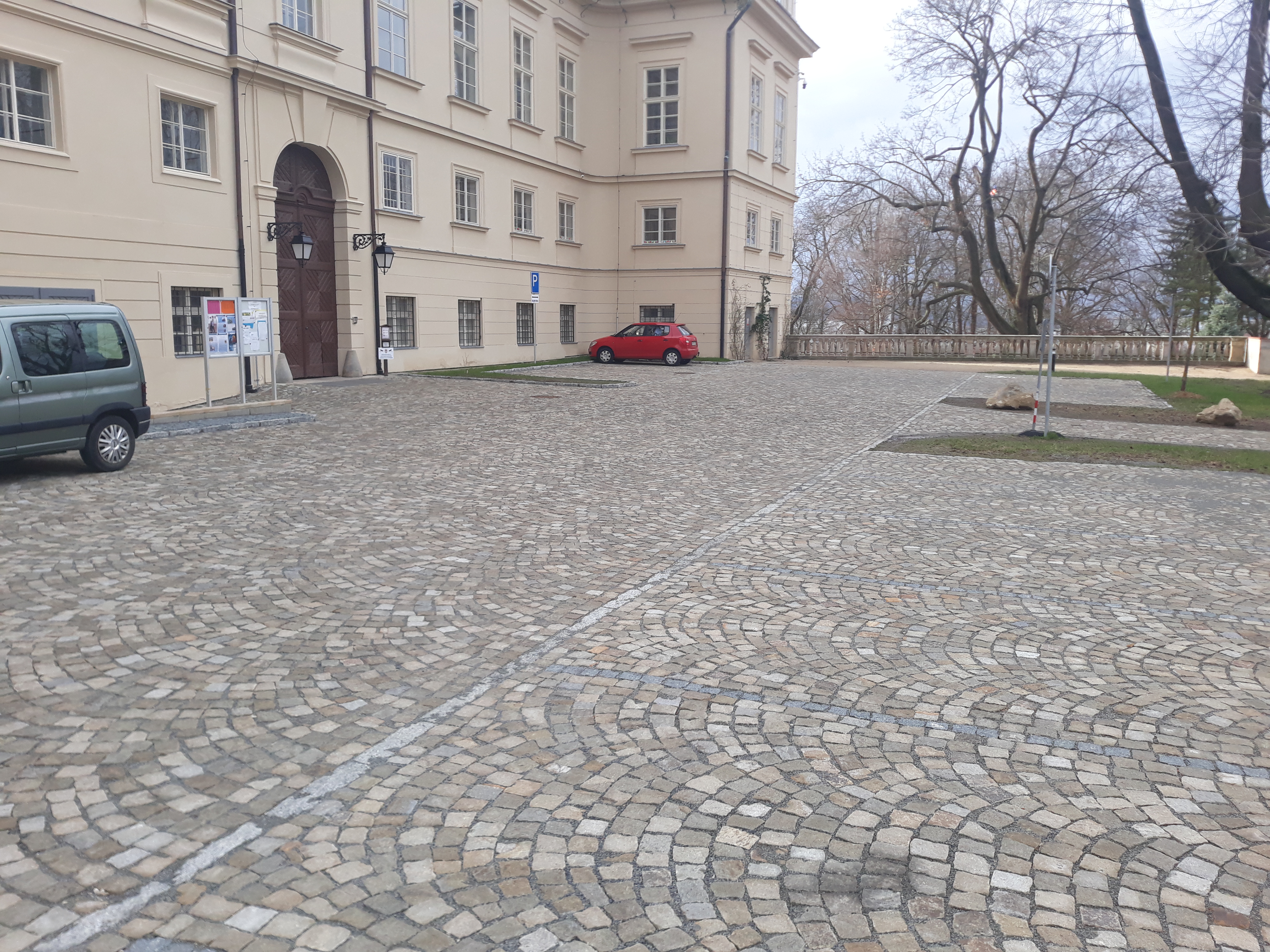 Úpravy ploch jihozápadně od zámku ve městě Kosmonosy včetně ozeleněné cesty. Součástí stavby byly sadové úpravy, silnoproudé rozvody, kontejnerové stání a dopravní značení.