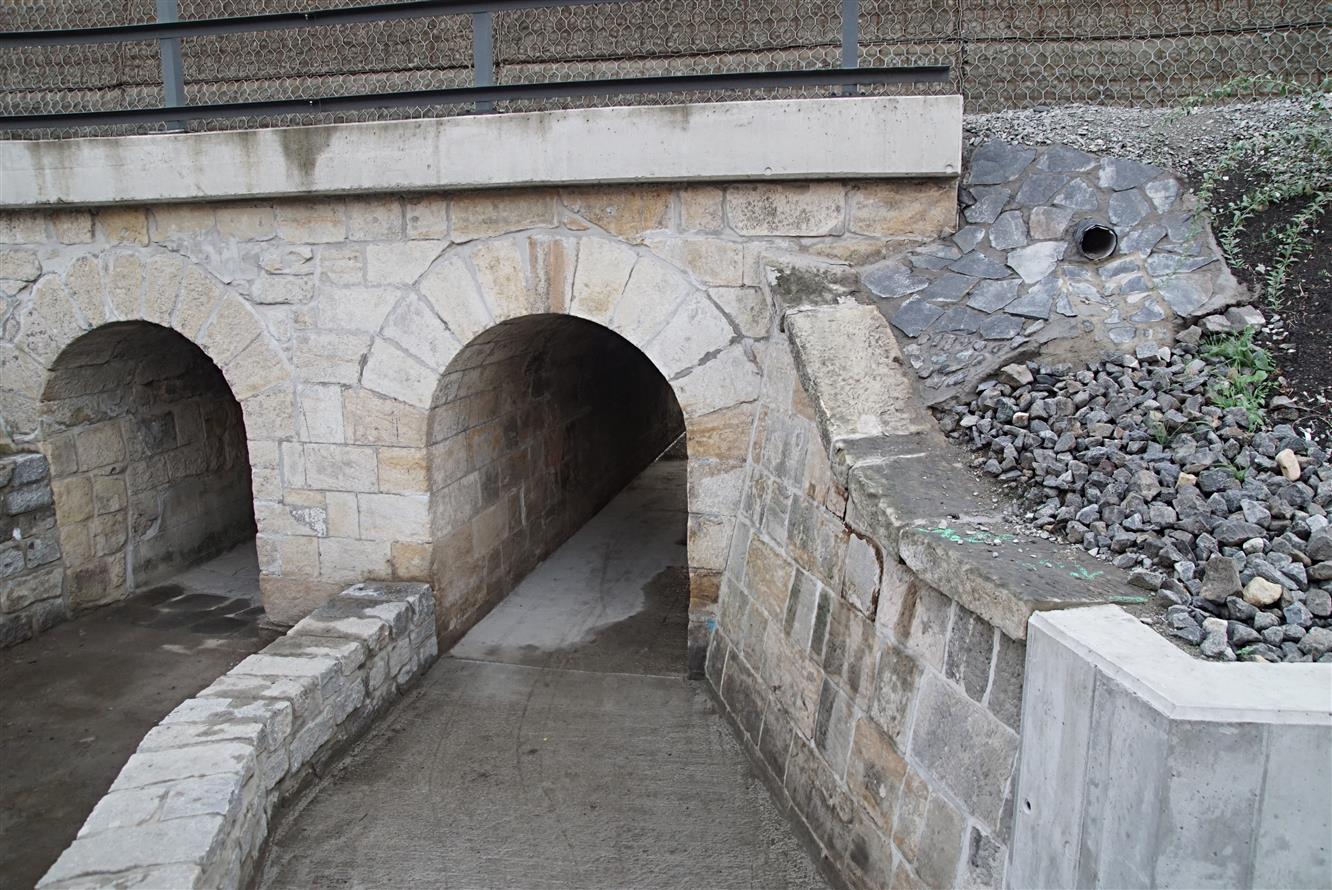 V rámci navrhovaných úprav byl pěší provoz převeden pod železniční trať skrz propustek. Byla provedena úprava a napojení ocelodřevěného mostku a chodníku, zárubní a opěrné zdi, železobetonové rampy a dělící zídky z lomového kamene. Součástí stavby bylo odbourání opěr silničního mostku, výkopy pro rampy a dělící zídky, odstranění nánosů v korytě a v profilu propustku, úprava tvaru nábřežních zídek. Dále odvodnění, IS a veřejné osvětlení