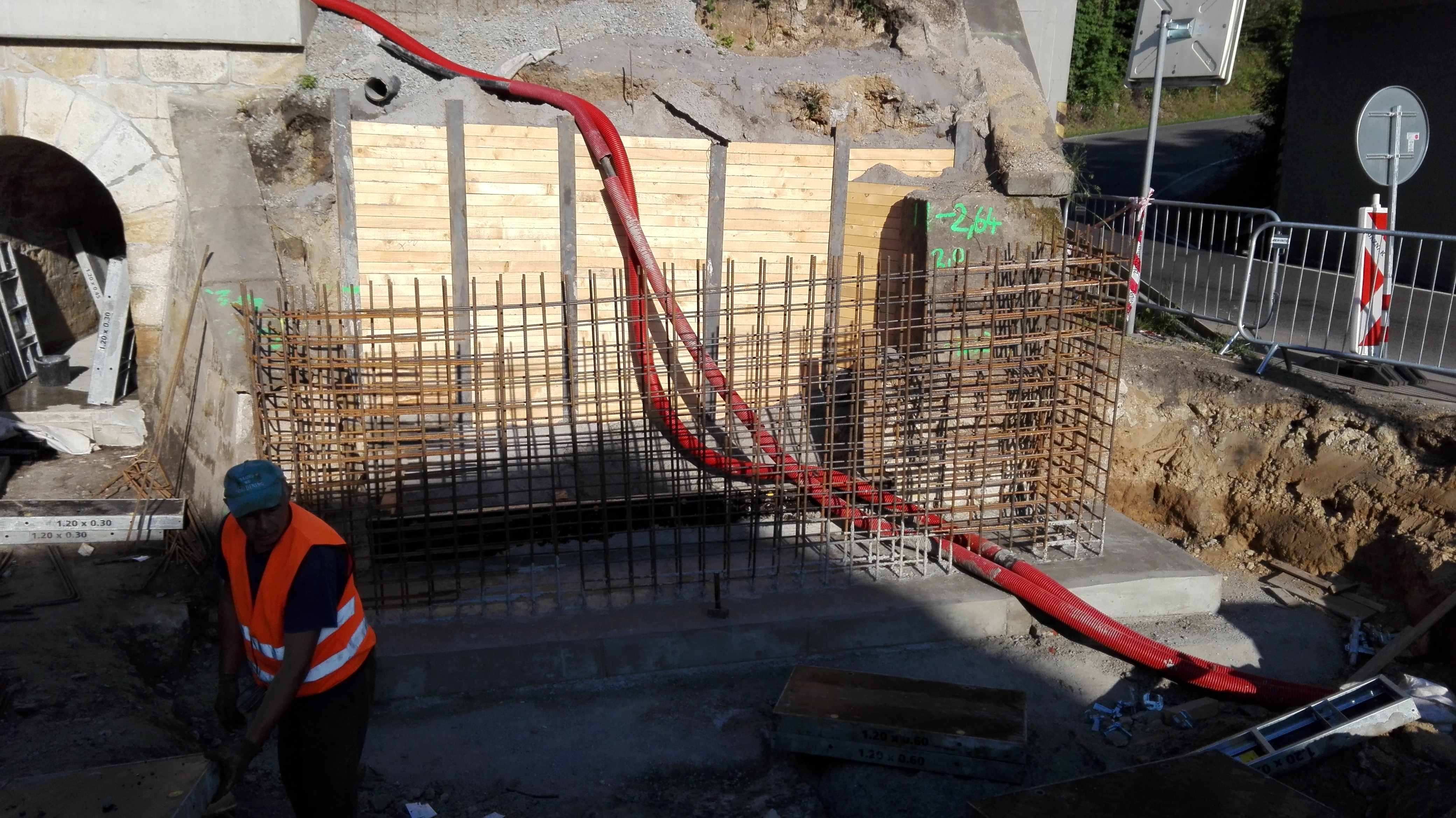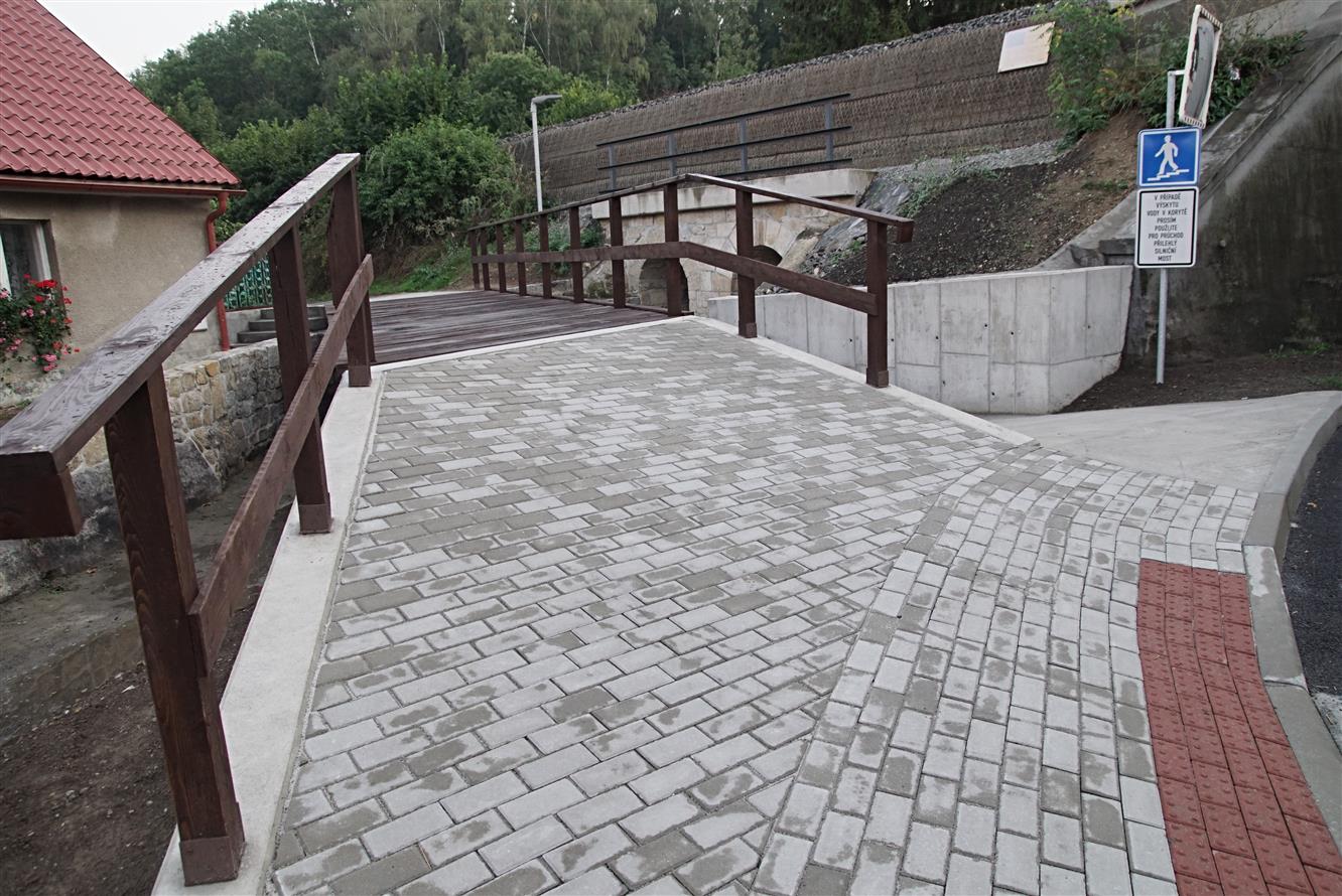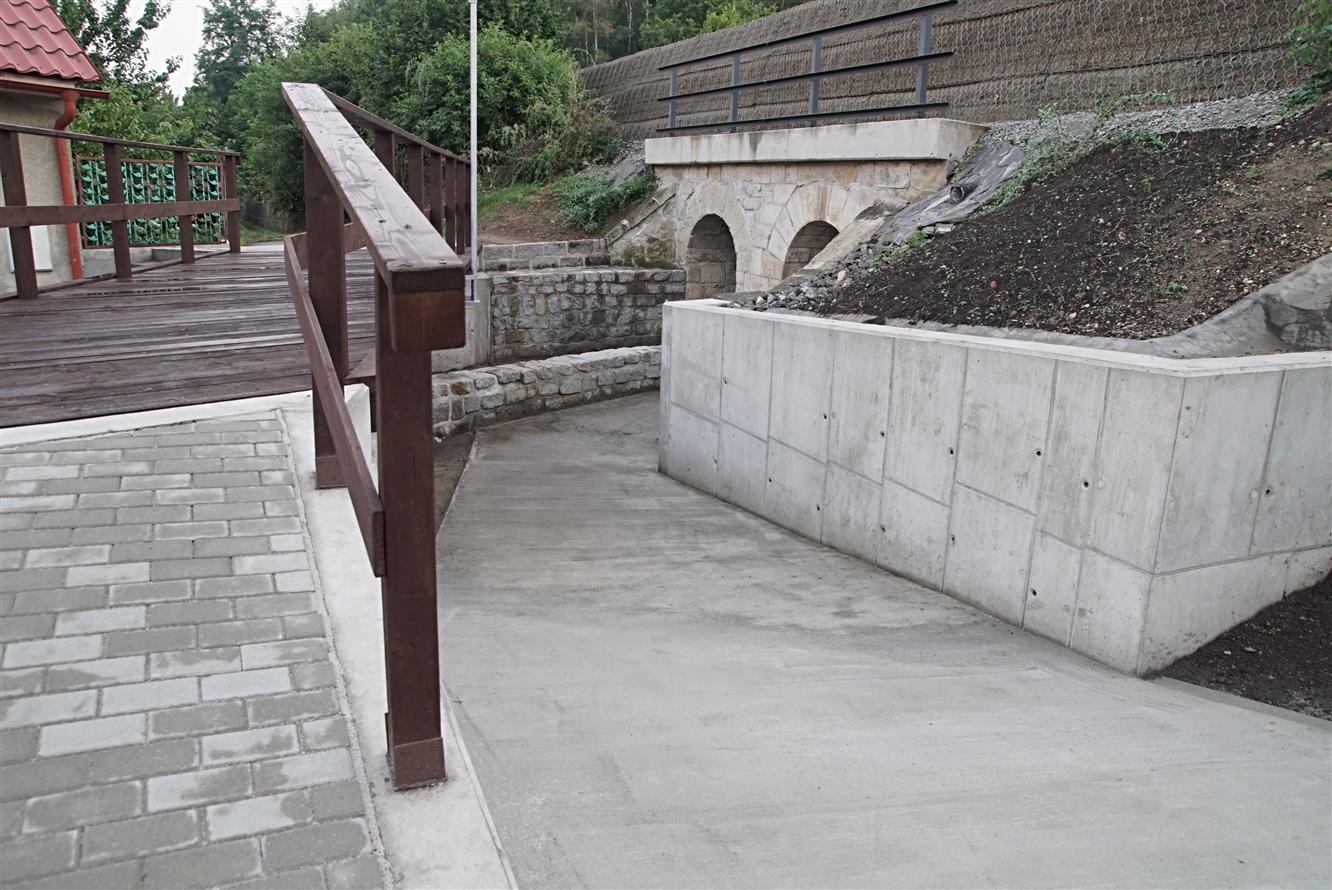 V rámci navrhovaných úprav byl pěší provoz převeden pod železniční trať skrz propustek. Byla provedena úprava a napojení ocelodřevěného mostku a chodníku, zárubní a opěrné zdi, železobetonové rampy a dělící zídky z lomového kamene. Součástí stavby bylo odbourání opěr silničního mostku, výkopy pro rampy a dělící zídky, odstranění nánosů v korytě a v profilu propustku, úprava tvaru nábřežních zídek. Dále odvodnění, IS a veřejné osvětlení